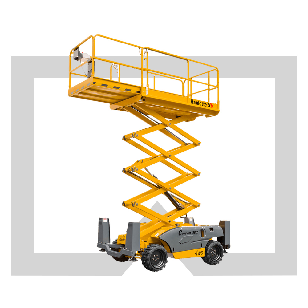 La plataforma tijera diésel Haulotte Compact 12 DX presenta una altura de trabajo de 12,06 metros y una altura de plataforma de 10,06 metros, siendo su capacidad de carga de 450 Kg.